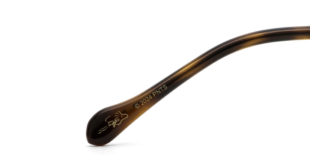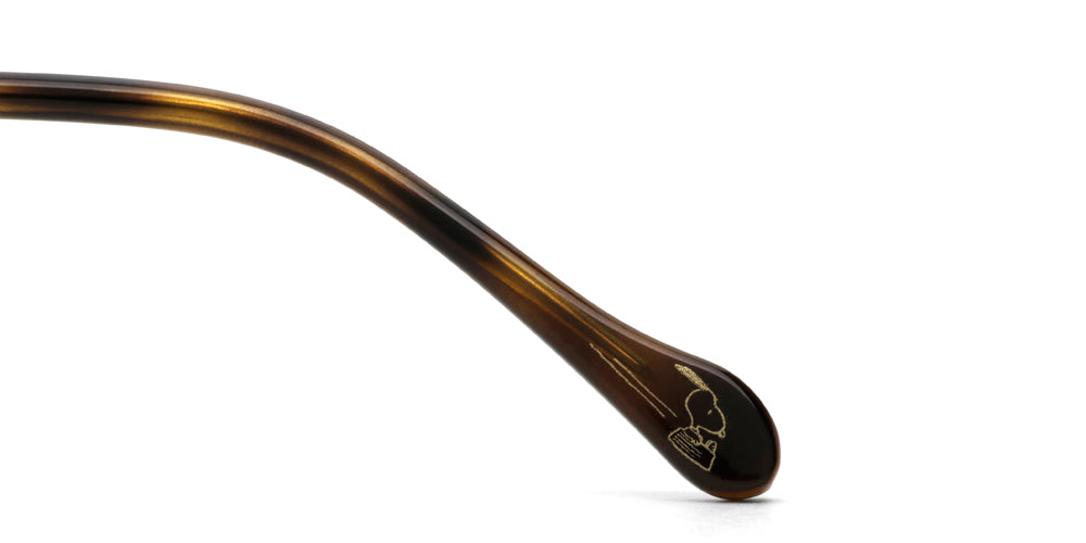 The inner sides of the temples are printed with Snoopy playing on the slide and Woodstock catching up to him. Snoopy's embossed three-dimensional pattern is added to the outside of the temples.